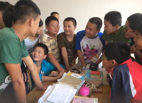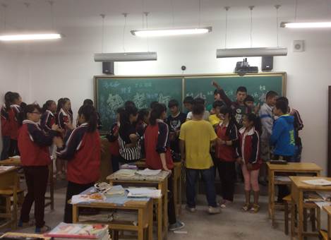 在这几天,队员们实行跟班政策,每名志愿者负责一个班级,跟随学生一起听课,与学生们一起分小组讨论,为他们答疑解难。数学课堂中,发挥我们的学科优势为学生们发散思维,拓展思路;英语课堂中,与同学一起学习,为他们补充课外的知识点,向学生介绍一些英语习语,提高学生的英语使用能力,拓宽知识面;音乐课上,与同学们一起唱歌,在温馨而甜蜜的歌声中融合着浓浓的师生情;此外,还一起回顾历史,纵览地理,探晓生物,欢声笑语,寓教于乐。队员们还利用晚自习时间,和同学一起制作莫比乌斯环,在制作的过程培养学生的动手能力,打破学生对图形的常规认识,亲身感受几何的奥秘;利用自习时间,和学生一起探索笔画的奥秘,在尝试中总结笔画的规律,让学生学会归纳总结;和学生一起做游戏,英语单词接龙、遇七拍掌,以及一些提高团队合作能力的小游戏。