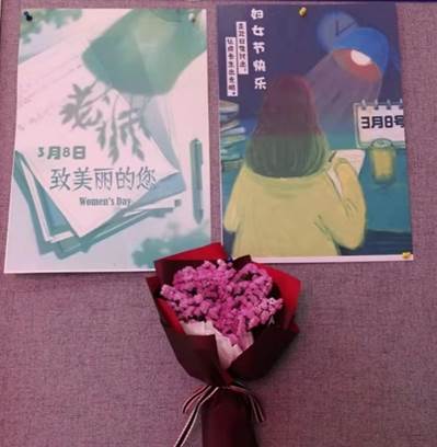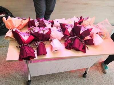 在数学楼门口,鲜花和礼物整齐得摆放在桌上,“致美丽的您”海报也张贴在学院门口。学生代表们站在门口,给每一位女老师们送上一束美丽的鲜花,以表达对老师们的感恩和祝福。