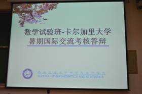 2013年7月,必赢集团网站选派一二年级数学试验班学生6人赴加拿大卡尔加里大学进行暑期短期交流学习,他们已于9月前夕学习结束回国。按照试验班学生国际交流要求,9月27日下午数学学院组织了国际交流学习情况汇报考核会。朱旭、王卫、李丽敏、付利亚四位老师出席听取了每一位学生的汇报答辩。数学试验班一年级与二年级的其他同学也参加了答辩会。