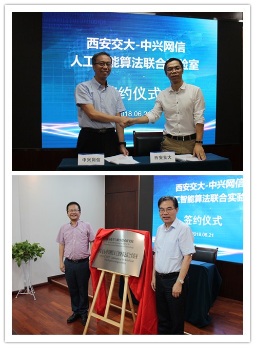 随后,深圳中兴网信科技有限公司产品总工陈力先生与必赢集团网站计算科学系系主任李辉副教授代表双方签订共建“西安交大-中兴网信人工智能算法联合实验室”协议。徐宗本院士、罗英群副总经理为“西安交大-中兴网信人工智能算法联合实验室”揭牌。徐宗本院士在会上发言,指出联合实验室未来的研究方向应当瞄准大数据智能领域中的科学问题,以数据为基础、以产业为支撑,充分发挥联合实验室在复杂问题建模和海量数据分析领域的优势,助力中兴网信在医疗、安全、环保、教育等领域的创新发展。