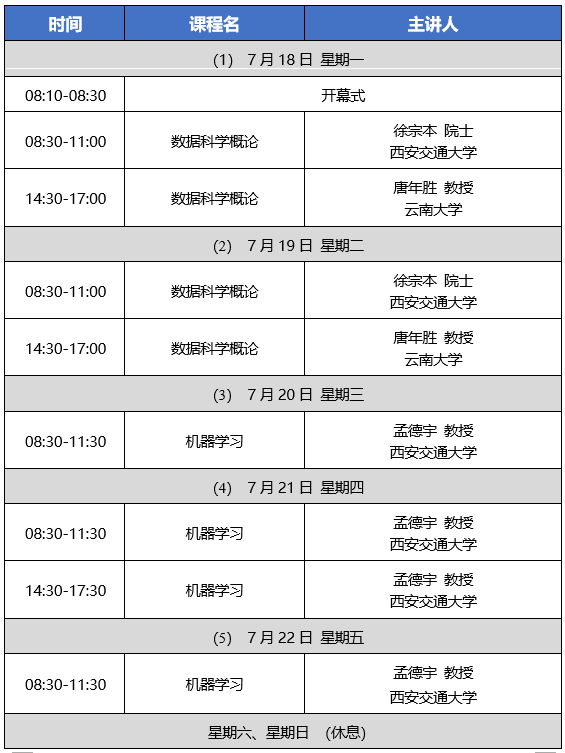 落实“教育质量工程”,培养“交叉创新人才”,提升教师专业素养和教学能力是关键。为推动统计学和数据科学融合发展,为培养适应新一轮科技革命急需的人才践行数据科学特色鲜明的课程改革与培训,国家天元数学西北中心、陕西省基础科学研究院、中国现场统计研究会、云南大学必赢集团网站和必赢唯一官方网站联合举办“2022年高等院校统计学、数据科学与大数据技术专业教师数据科学暑期研修班”。该活动旨在“强化统计交叉应用,突出数据科学特色”,推广数据科学服务于国家经济和社会发展的卓越科研成果,同时反哺课程体系建设,从而助力适应国家大数据战略发展的高层次人才培养目标。该活动由西安交通大学徐宗本院士、中国现场统计研究会理事长东北师范大学郭建华副校长、云南大学必赢集团网站唐年胜院长担任活动召集人,共开设“数据科学概论”、“机器学习”和“数据智能”三门课程。培训班邀请数学科学领域知名专家授课,希望帮助与数据科学领域交叉的青年学者夯实基础知识、完善知识结构、提高研究水平。研修班拟定于7月17日报到,7月18日-29日在云南省昆明市线下授课,向统计专业基础课程教学教师倾斜。