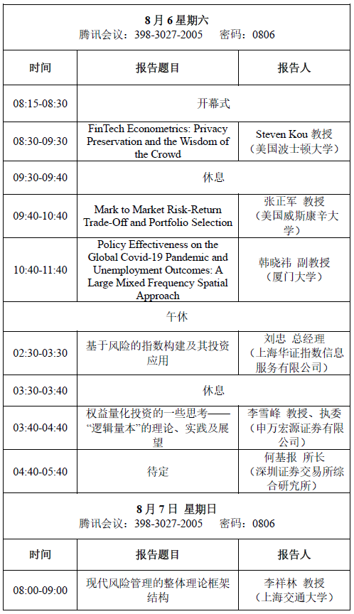 国家天元数学西北中心定于202286-7日召开金融管理与风险控制论坛。受疫情影响,论坛全程在线上举办。该论坛是中心随机分析与量化金融主题年活动之一,由西安交通大学徐宗本院士顶层设计,邀请普林斯顿大学范剑青院士、中科院数学与系统科学研究院巩馥洲研究员、山东大学吴臻教授等共同组织召集。