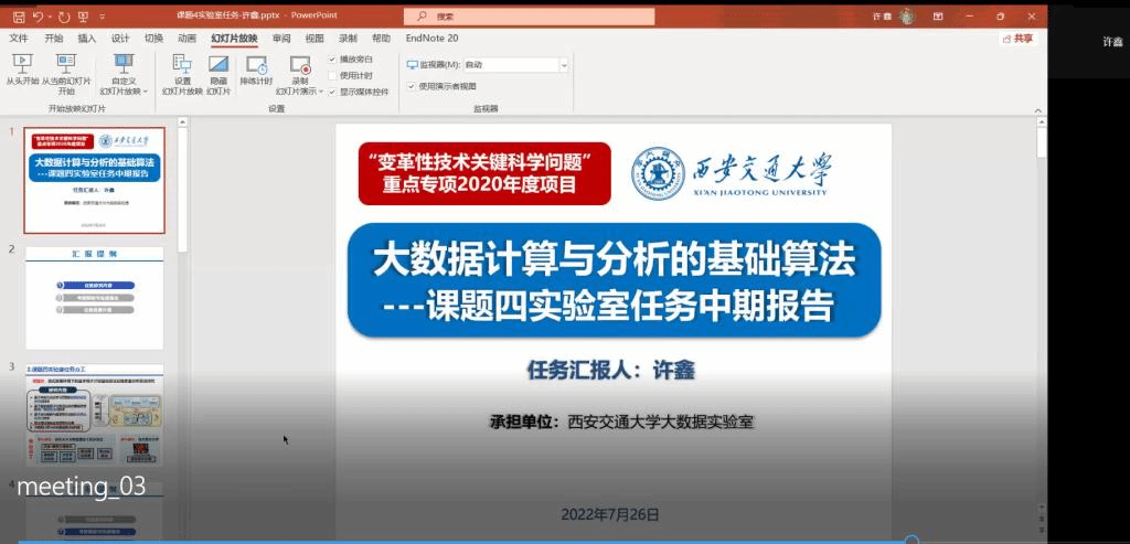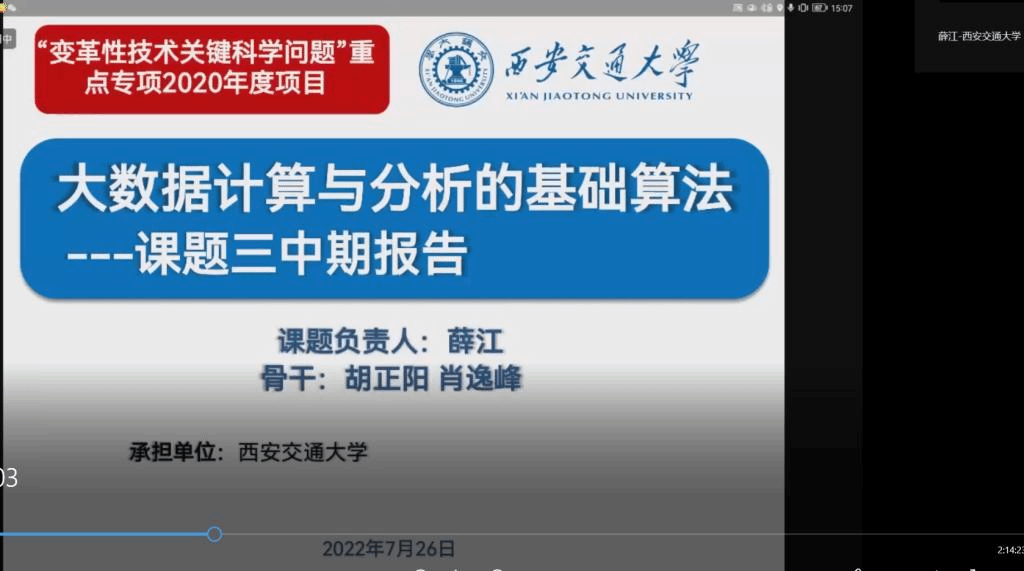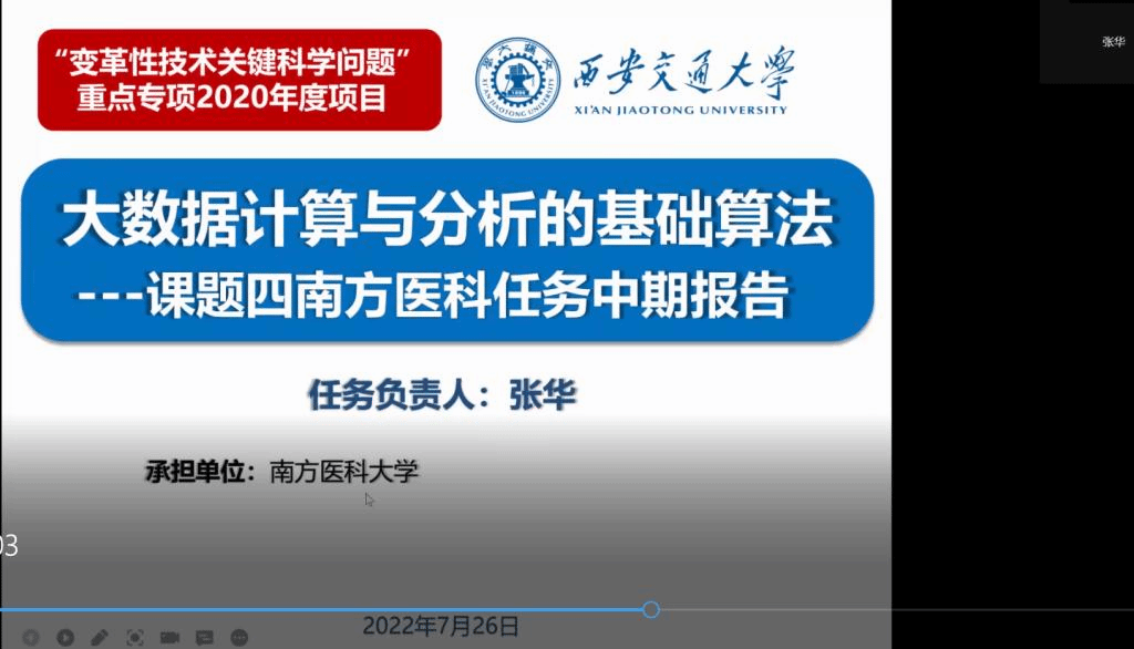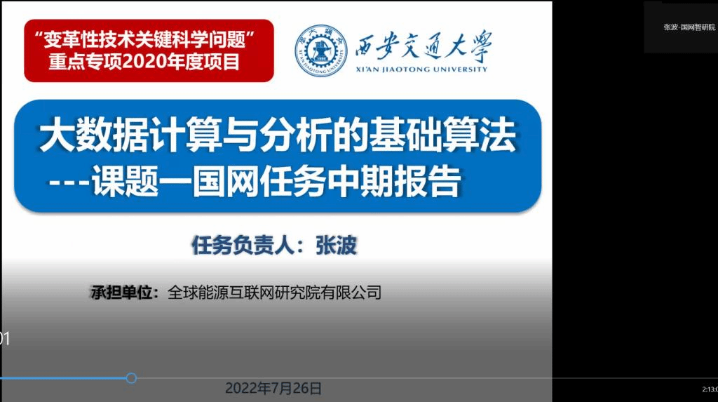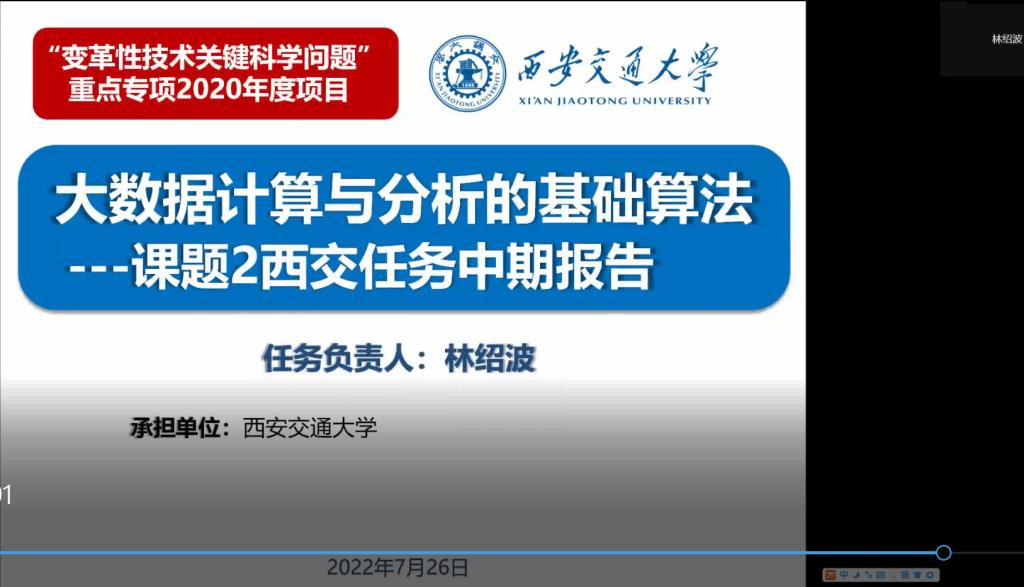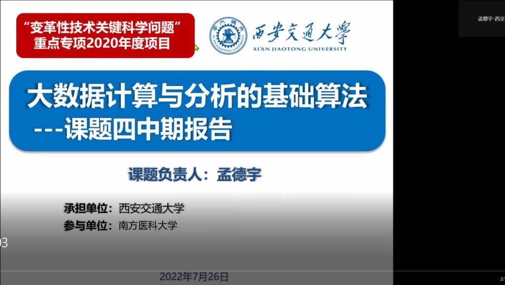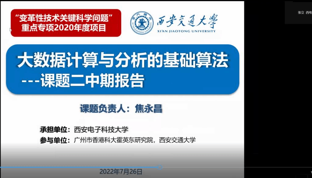 2022726日,西安交通大学主持召开国家重点研发计划“变革性技术关键科学问题”重点专项“大数据计算与分析的基础算法”项目中期进度汇报会。会议采用线上方式进行,项目负责人西安交通大学孟德宇教授,课题一负责人南京大学李武军教授,课题二负责人西安电子科技大学焦永昌教授,课题三负责人西安交通大学薛江教授,以及西安电子科技大学张立教授、全球能源互联网研究有限公司张波研究员、香港科技大学霍英东研究院杨灿教授、南方医科大学张华教授、西安交通大学林绍波教授、西安交通大学李飞高级工程师、西安交通大学许鑫工程师等相关研究骨干参加会议。项目负责人孟德宇主持会议。