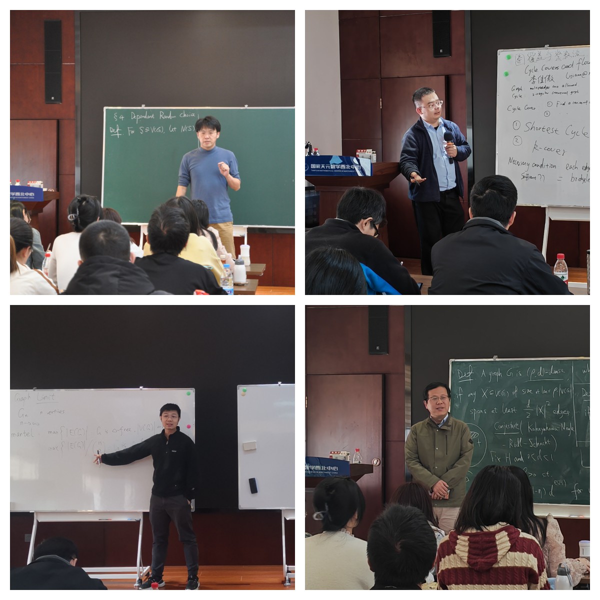 开班仪式结束后,讲习班进行为期5天的课程与研讨。胡平副教授介绍了旗代数和图极限的基本理论及二者的相互联系,解答了如何应用旗代数解决实际问题。李佳傲副教授讲授了圈覆盖与整数流中的一些经典结果和前沿问题。马杰教授介绍了退化类图兰问题中的经典结论和方法,并将其延伸到相关的前沿研究中。学员们认真聆听课程,并将所学内容与自己的实际研究工作相结合,同专家们深入交流。大家纷纷表示讲习班课程紧凑、内容丰富、学习氛围浓厚、收获颇丰。