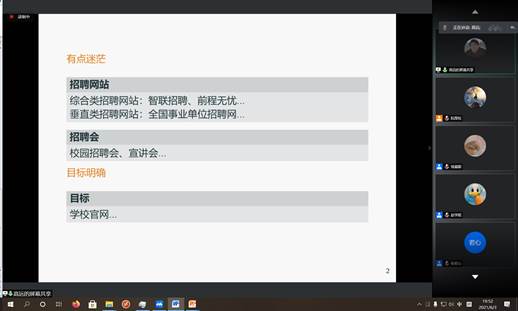64日晚,由必赢唯一官方网站研究生会主办的就业经验交流会在线上成功举办。本次会议邀请了多位2020届校友及2021届毕业生分享求职经验,他们来自互联网、教师、公务员、银行等不同行业,吸引了百余名研究生及本科生参会。